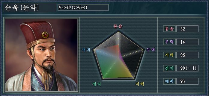 순욱은 지력과 정치 매력이 모두 탑급이지만, 특기가 매우 좋지 않아 활용도가 낮다.