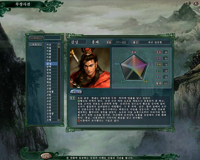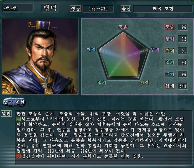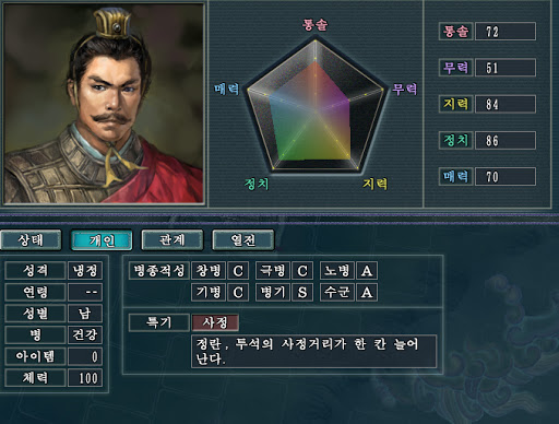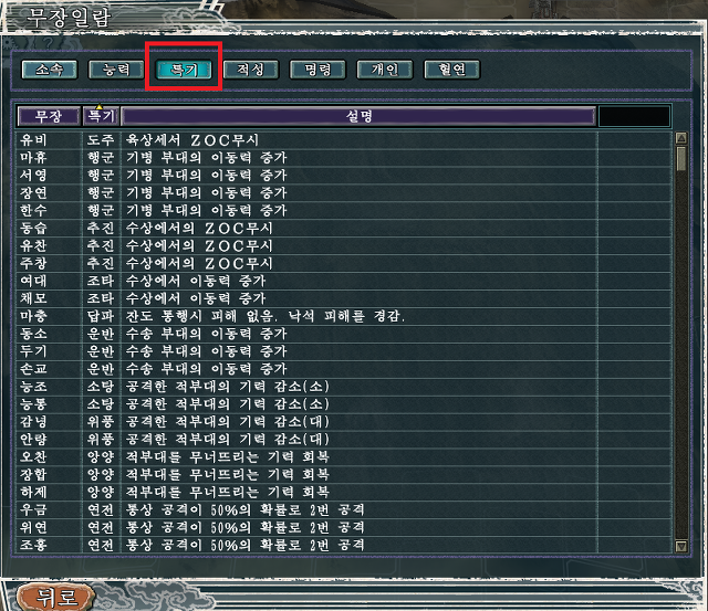 각 무장들의 열전과 더불어 능력치의 상세정보가 깔끔하게 정돈되었다.