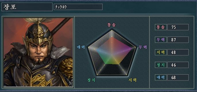 통솔 (중) 전수를 장포에게 행할 시 통솔 80까지 상승하므로 성장 가치가 매우 높은 장수다.