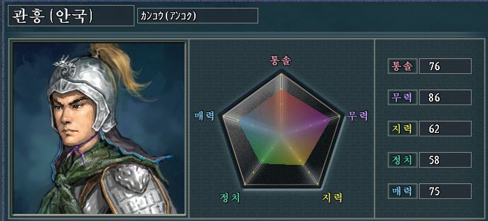 관평 관색 관흥과 비슷한 수준의 통솔 무력을 보유 중이며 이는 후반에 더 성장할 수 있다.