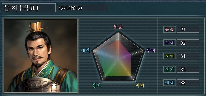 등지는 문관이면서도 높은 통솔을 보유 중이며, 81의 지력 그리고 논객 특기도 있다.