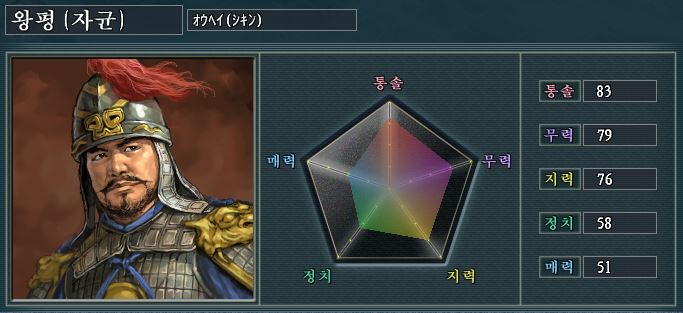 능력치는 지력 외에 볼품없으나, 특기는 '백출'이다. 부대 책략 소모 기력을 1로 만들어줘 매우 효율적인 전투를 할 수 있다.